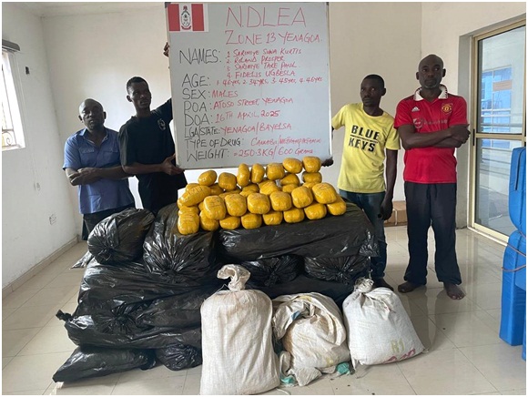 “Not less than 557.2kg of skunk, 5.6kg of methamphetamine and 29.8grams of heroin were recovered from a house along Major General Isaiah Alllison Street, Opolo, Yenagoa, Bayelsa state where four suspects were arrested when NDLEA operatives raided the premises on Wednesday April 16. The four suspects arrested during the raid include: Sarimiye Suwa Kurtis, 46; Roland Prosper, 34; Sarimiye Tare Paul, 45; and Fidelis Ugbesla, 46.