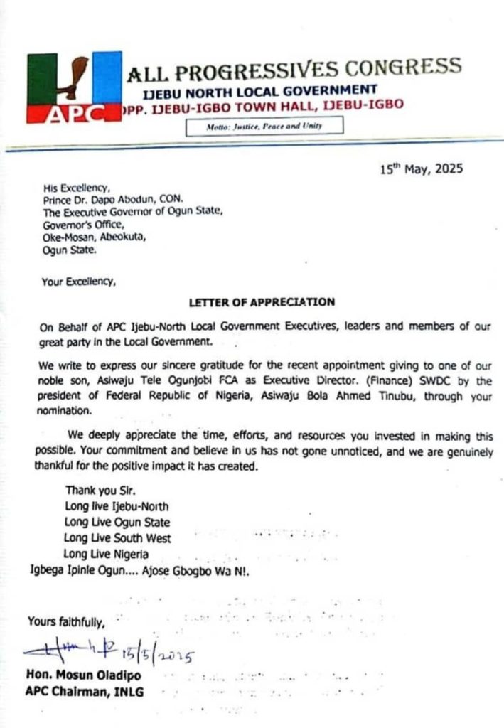 Governor Prince Dapo Abiodun, CON, has been sincerely thanked by the All Progressives Congress (APC) in Ijebu North Local Government for his assistance in appointing Alhaji Tele Ogunjobi as the Executive Director of Finance at the South West Development Commission (SWDC). Party leaders and members praised the governor's efforts in putting Alhaji Ogunjobi forward for the role in a letter signed by Hon. Mosun Oladipo, JP, Chairman of the APC in Ijebu North Local Government. The letter emphasized how the community has benefited from the governor's dedication to and faith in the potential of local government.