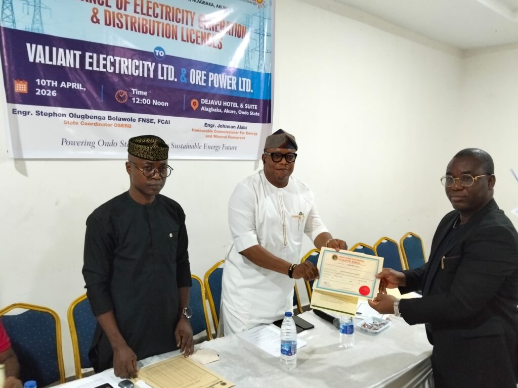 The Ondo State Government, through the Ondo State Electricity Regulatory Bureau (OSERB), has granted power generation and distribution licenses to Ore Power Limited and ASB Valiant Electricity Limited under the Ondo State Electricity Law, 2020.
